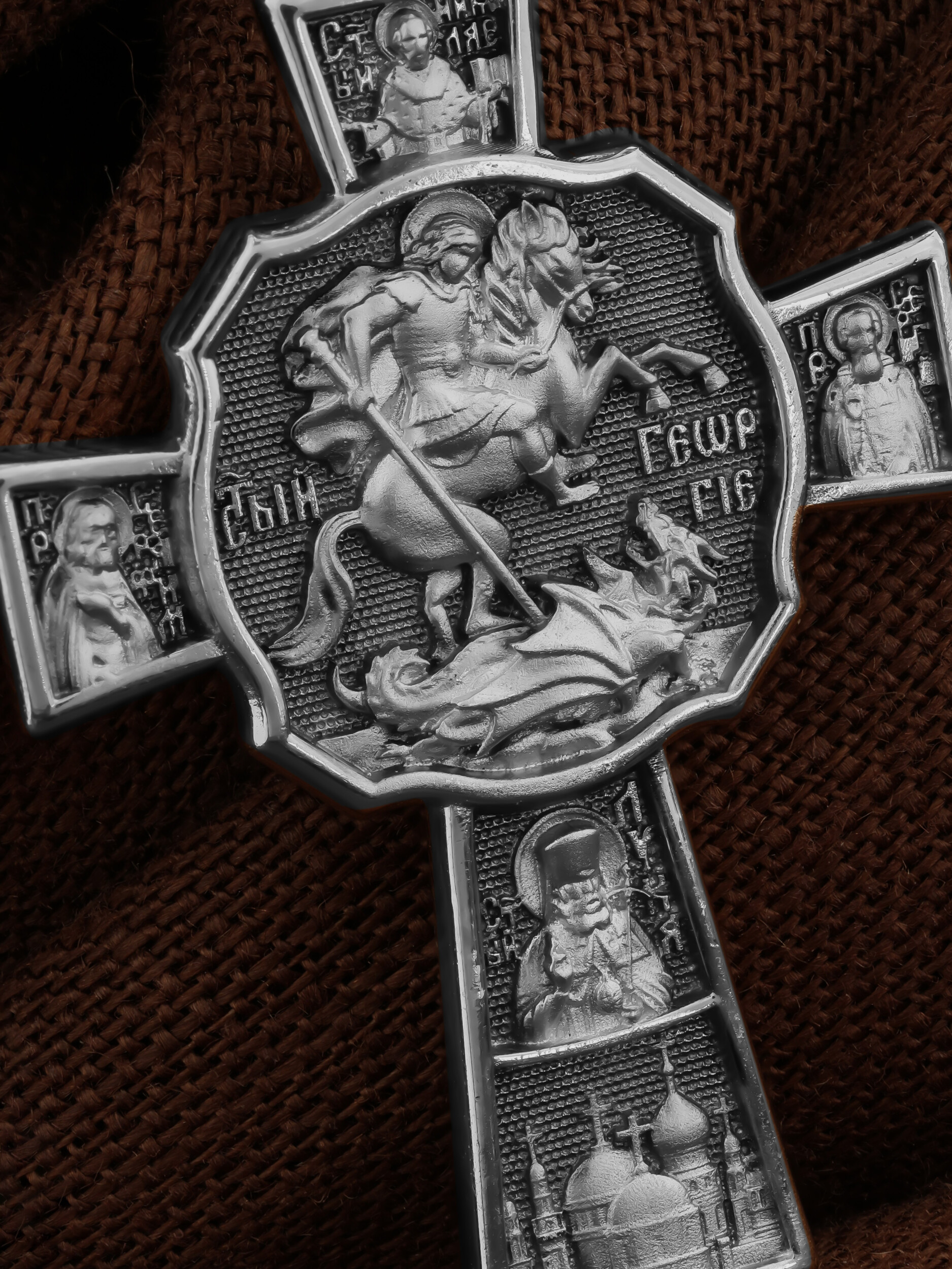В центре оборотной стороне креста помещен образ Святого Великомученика Георгия Победоносца — одного из самых почитаемых и удивительных святых. На образке он изображен как воитель поражающий копьем огнедышащего змея. Змей символизирует собою сатанинские силы. Справа помещен образ Святого Преподобного Сергия, игумена Радонежского, чудотворца, слева — Преподобного Серафима Саровского, чудотвореца. Выше помещен образ Святителя Николая архиепископа Мир Ликийских, чудотвореца, ниже — образ святителя Луки (Войно-Ясенецкого), архиепископа Симферопольского и Крымского, исповедника и изображение Храма. На кулонном кольце изображен Спас Нерукотворный — образ Господа и Спасителя нашего Иисуса Христа, чудесно отпечатавшийся на плате, котором Христос вытер свой лик.