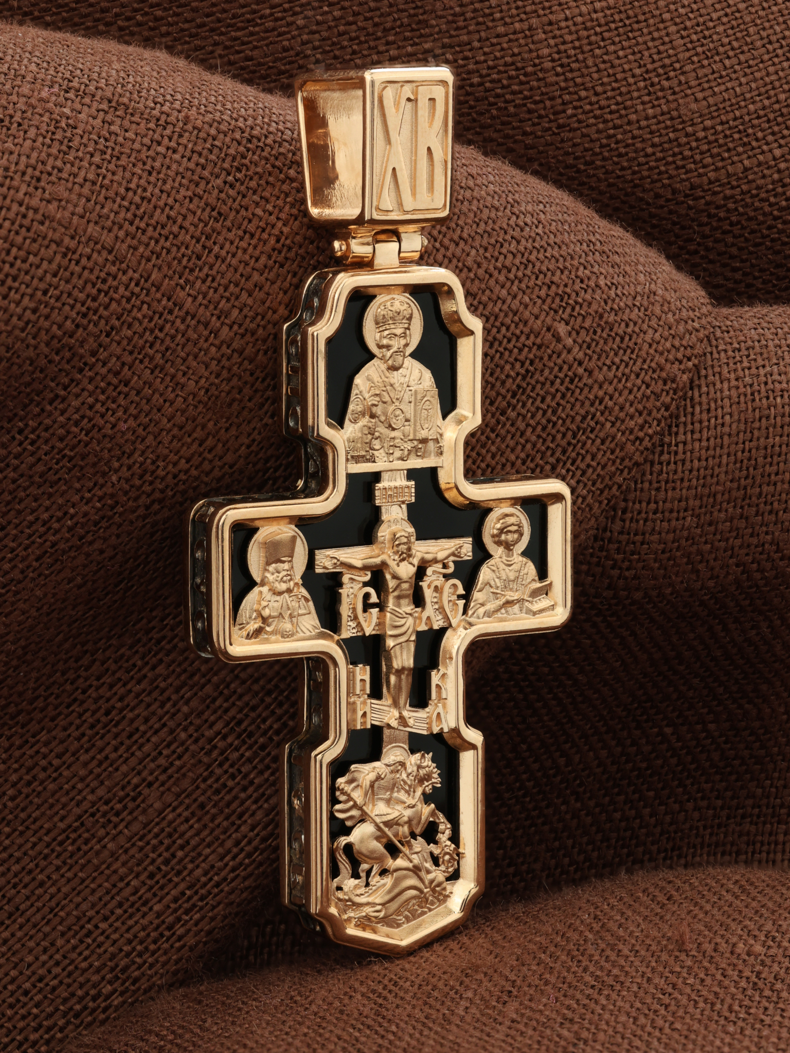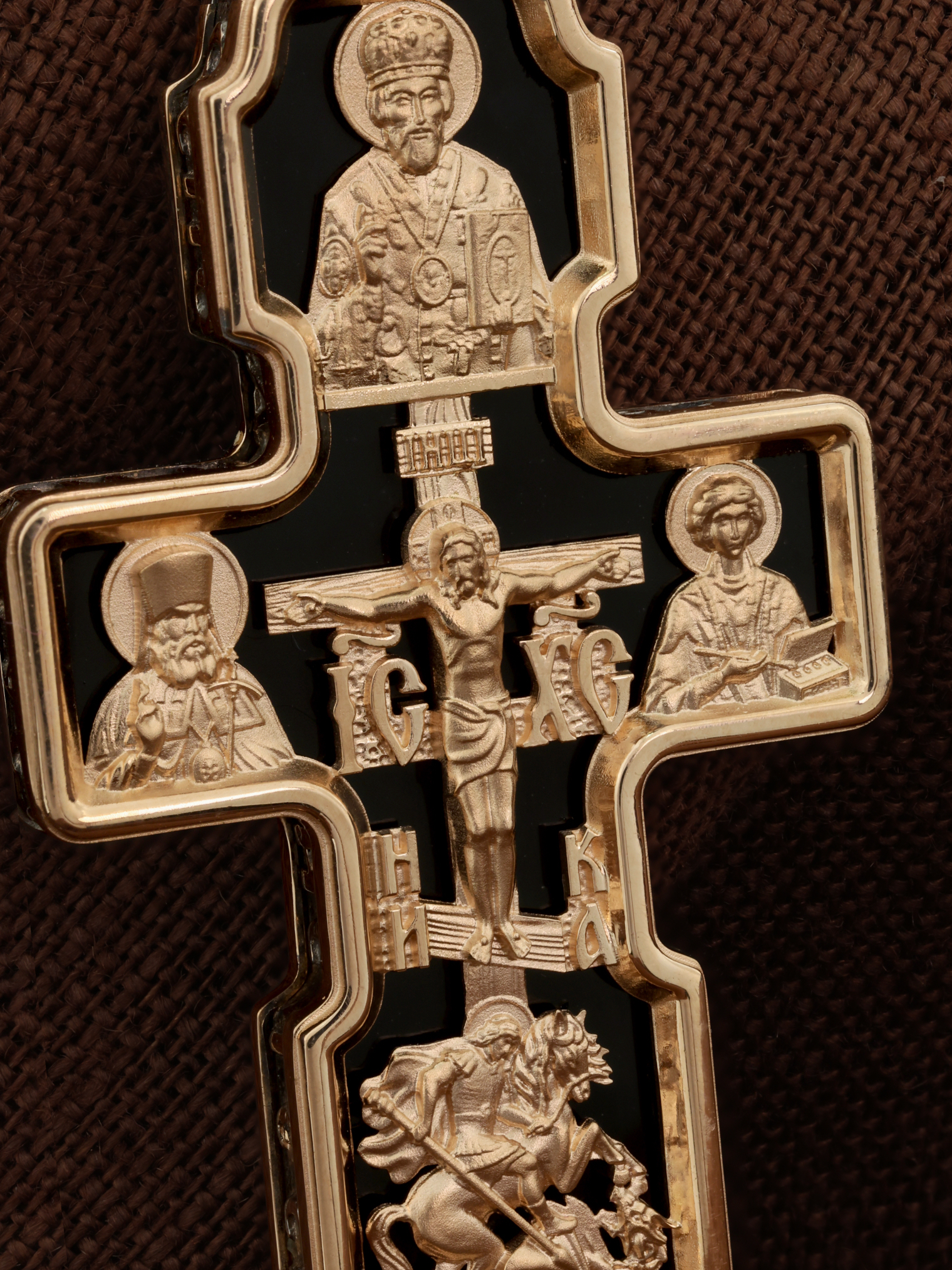 На лицевой стороне креста изображено Распятие Господа и Спасителя нашего Иисуса Христа. Христос, подвергнутый на кресте мучительной казни, своими страданиями искупил нас от древнего греха и даровал нам жизнь вечную. Без Распятия не было бы Воскресения Христова, и поэтому Крест из орудия казни обратился в святыню, в которой действует Благодать Божия. На верхней табличке, выше головы Иисуса, расположена надпись, составленная Понтием Пилатом на трех языках — «IНЦI». Она означает «Иисус Назорей, Царь Иудейский». Надпись «IС ХС» означает Иисус Христос и помещается на разных сторонах поперечной (большой) перекладины креста. На нижней перекладине находится надпись –«НИКА», что означает победитель. Над Распятием размещен образ Святителя Николая Чудотвореца, архиепископа Мир Ликийских. Ниже Распятия — образ Святого Великомученика Георгия Победоносца. Он изображен как воитель, сидящий на вздыбленном коне и поражающий копьем огнедышащего змея. Слева — образ Святителя Луки (Войно-Ясенецкого), а справа — образ Святого великомученика и целителя Пантелеимона. На кулонном кольце находится надпись «ХВ», что означает Христос Воскрес.
