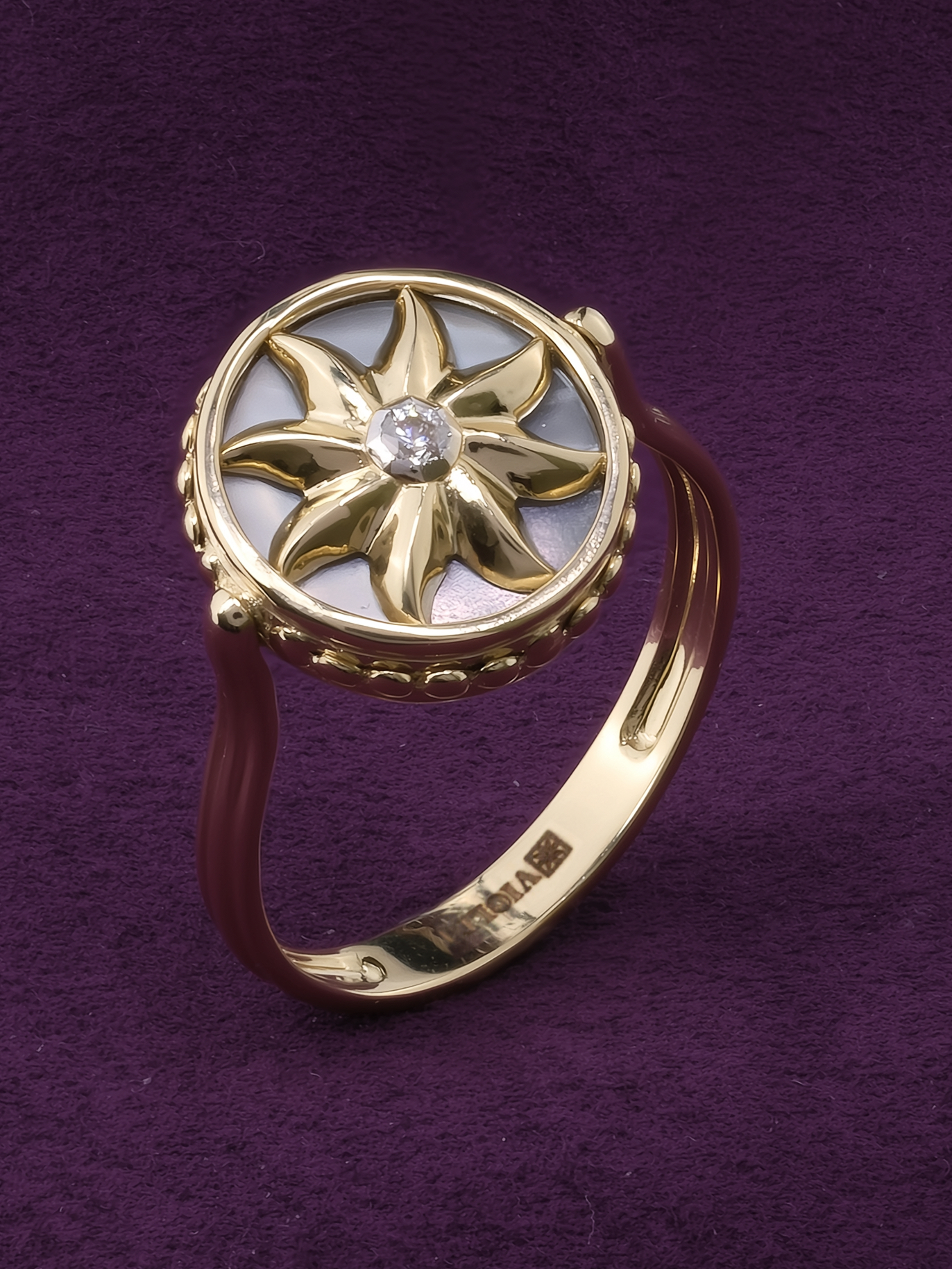Кольцо из лимонного золота c бриллиантами, ониксом и перламутром