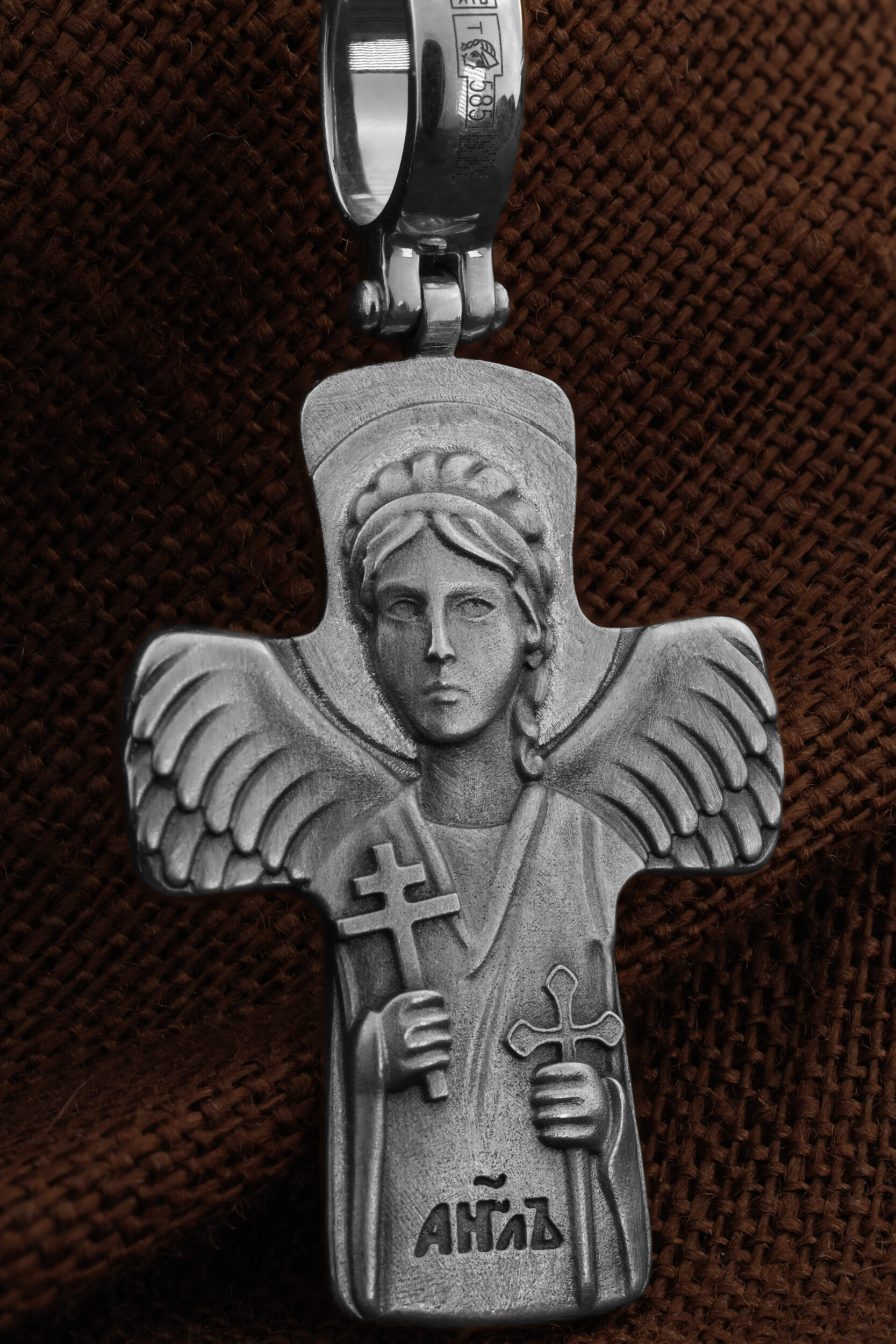 На оборотной стороне креста изображен Святой Ангел-Хранитель держащий в правой руке крест, а в левой — меч. Ангел-Хранитель — это Ангел приставляемый Богом к человеку при крещении для охраны и помощи в добрых делах. Он невидимо находится при человеке на протяжении всей его жизни, если человек сохраняет в себе любовь к Богу и истинную веру перед Ним. Ангел-Xранитель делают для нас все, что служит к истинному нашему благу и спасению. Невидимо пребывая при нас постоянно, он, руководствуя нас ко спасению, не только по нашему желанию таинственно наставляет нас на все доброе и полезное, не только возносит наши молитвы к Богу, но еще и сам от себя охраняют и защищают нас от врагов видимых и невидимых и ходатайствует за нас пред Богом.