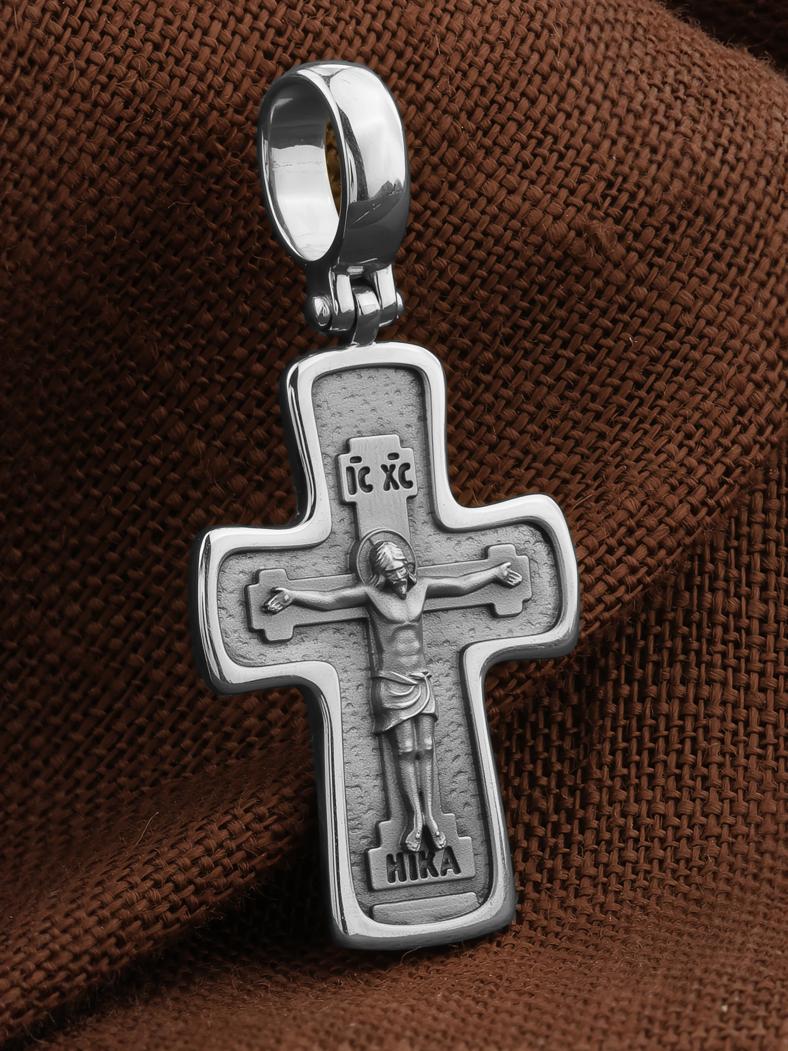 На лицевой стороне креста изображено Распятие Господа и Спасителя нашего Иисуса Христа, отдавшего Себя на смерть, для искупления грехов мира. Крест является символом жертвенной любви Всеблагого Бога к падшим людям, всепобеждающим духовным оружием христиан, основанием и средоточием церковной жизни. Господь сказал: кто хочет идти за Мною, отвергнись себя, и возьми крест свой, и следуй за Мною. (Мк. 8: 34). Надпись «IС ХС» означает Иисус Христос. Надпись –«НИКА» означает победитель.