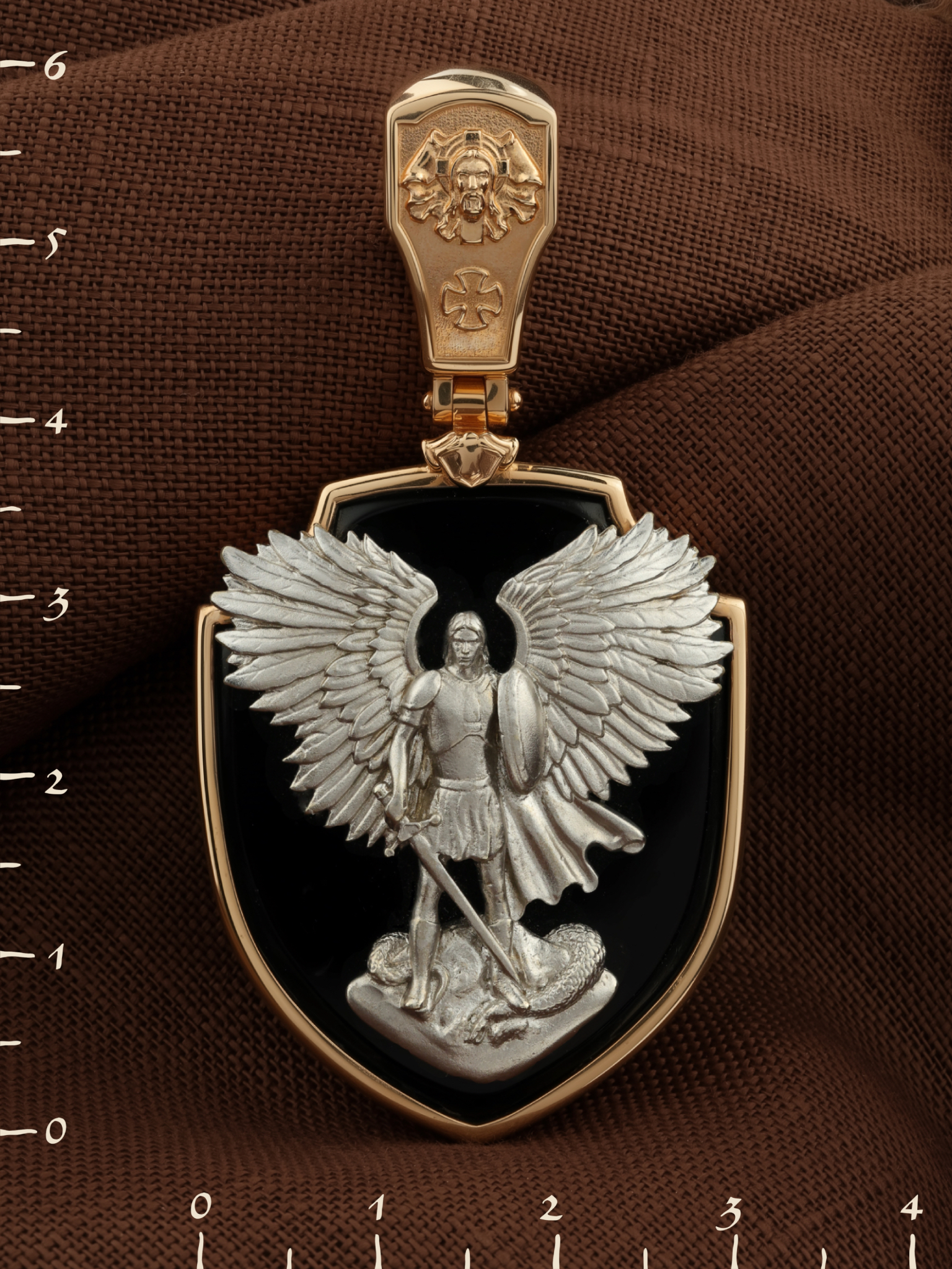 На лицевой стороне образка размещено изображение Архангела Михаила — верного служителя Божия, который низринул с Неба возгордившегося денницу с другими павшими духами. В Православии его называют Архистратигом, что означает глава святого воинства Ангелов и Архангелов. Образок сделан в виде воинского щита. Архангел Михаил изображен в воинственном виде с огненным мечом в правой руке и щитом в левой поражающим змея. Змей символизирует собою сатанинские силы. Архангел почитается, как покровитель воинов и всех верных Богу и ведущих борьбу против сил зла, борец против ересей, а также защитник душ умерших, страж райских врат. С древних времен прославлен своими чудесами Архангел Михаил на Руси. Примеров явления и помощи Архистратига Михаила в русской истории бессчетно. Архангел Михаил не перестает ратоборствовать за славу Творца и Господа всяческих, за дело спасения рода человеческого, за церковь и чад ее. И, согласно, Откровению Иоанна Богослова во время последней битвы небесных и дьявольских сил Михаил и его ангелы опять низвергнут люцифера вместе с его войском: «Михаил и Ангелы его воевали против дракона, и дракон и ангелы его воевали [против них], но не устояли, и не нашлось уже для них места на небе. И низвержен был великий дракон, древний змий, называемый диаволом и сатаною, обольщающий всю вселенную, низвержен на землю, и ангелы его низвержены с ним» (Откр.12:7−9). На кулонном кольце изображен Нерукотворный образ Господа и Спасителя нашего Иисуса Христа, чудесно отпечатавшийся на плате, которым Христос вытер свой лик.