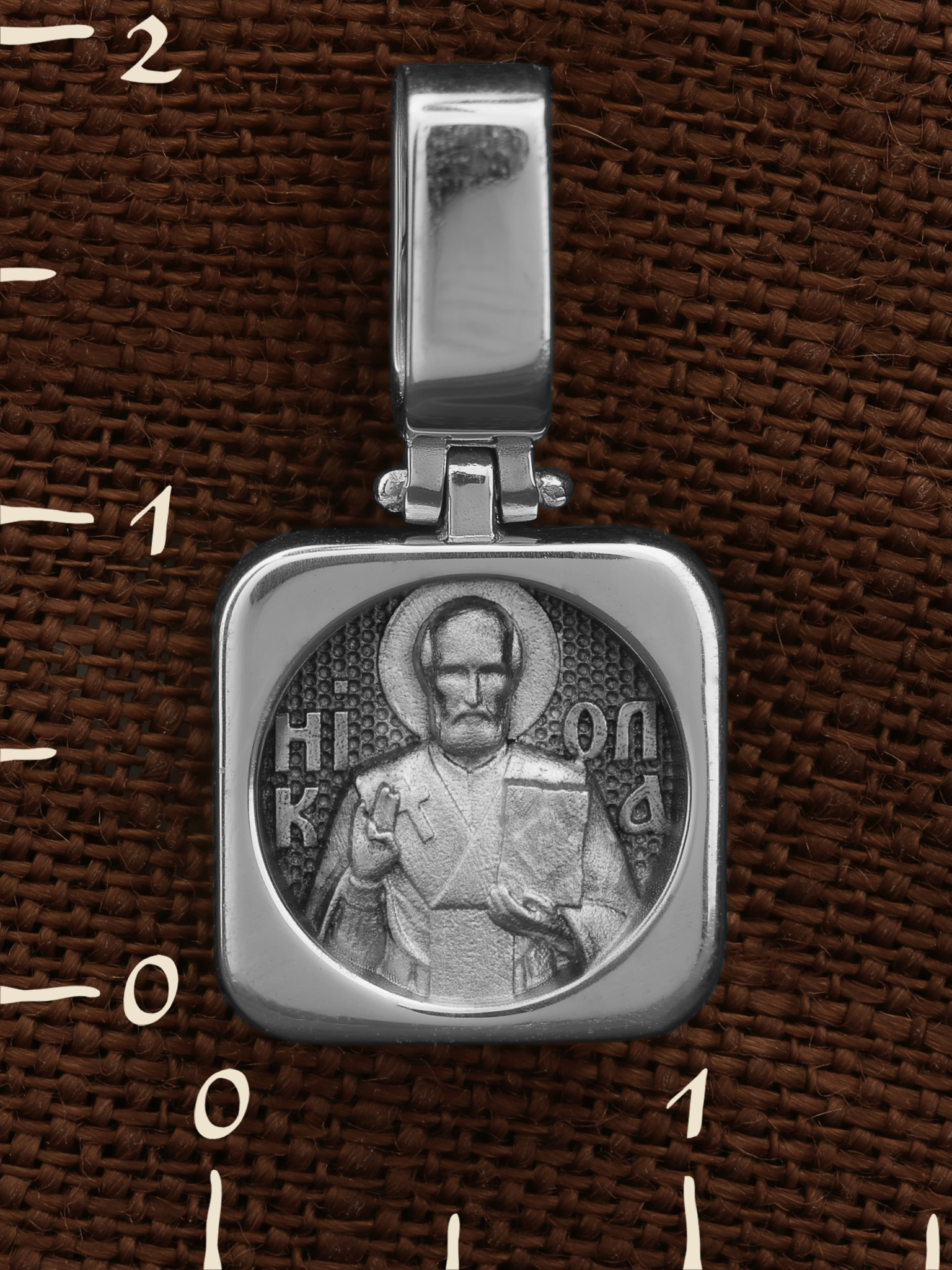 На лицевой стороне образка изображен Святитель Николай архиепископ Мир Ликийских, Чудотворец. Он является одним из самых почитаемых святых в православном мире. Святитель Николай родился во второй половине III века в Малой Азии в Ликийском городе Патары. С рождения Божий Угодник проявлял необыкновенные дарования. Сохранилось Предание, что во время крещения он, никем не поддерживаемый, простоял в купели три часа. Приняв сан священника, святитель Николай стал проводить еще более строгую подвижническую жизнь. Избранник Божий Николай стал вершиной всех добродетелей, поднятой до райской высоты. С кем из величайших праведников не сравнялся он образом духовной красоты, кому из них не последовал в своих деяниях и чудотворениях? Вся жизнь святого Николая — это служение Богу. Много великих и преславных чудес сотворил великий Святитель Николай Угодник. Он помогал сущим в бедах, укрощал штормы, спасал от потопления и выносил на сушу из глубины морской, освобождал из плена и приносил освобожденных домой, избавлял от уз и темницы, защищал от посечения мечом, освобождал от смерти и подавал многим различные исцеления: слепым — прозрение, хромым — хождение, глухим — слух, немым — дар слова.