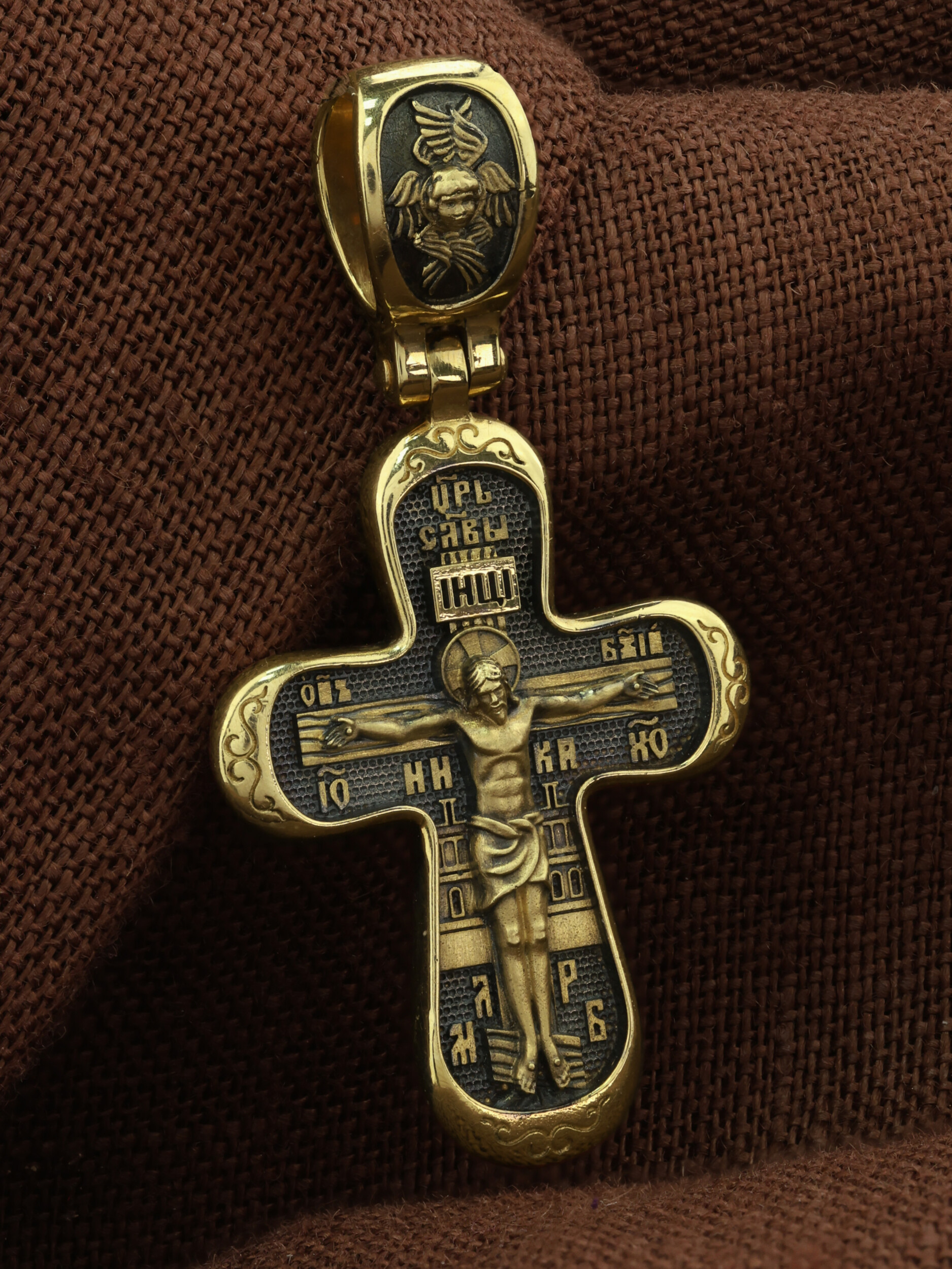Центральную часть лицевой стороны занимает Распятие Христа — образ жертвы, принесенной Господом за грехи людей. Именно ко Христу, сошедшему на землю ради нашего спасения, возносятся все молитвы. Над титлом видим слова «ЦРЬ СЛВЫ» — Царь Славы. Верхняя перекладина символизирует собой табличку с надписью «IHЦI» — Иисус Назарянин Царь Иудейский. Над перекладиной пишется словосочетание «СНЪ БЖIЙ» — Сын Божий, ниже перекладины добавляется: «НИКА» (греч. — Победитель), рядом пишется сокращенно имя Спасителя «IC XC» — Иисус Христос. Буквы «МЛ» «РБ», написанные в нижней части креста, означают: «Место Лобное Рай Бысть». Возвышение, на котором стоит Крест, символизирует гору Голгофу, на которой произошло Распятие. У подножия Креста изображают прах Адама, обозначенный черепом.