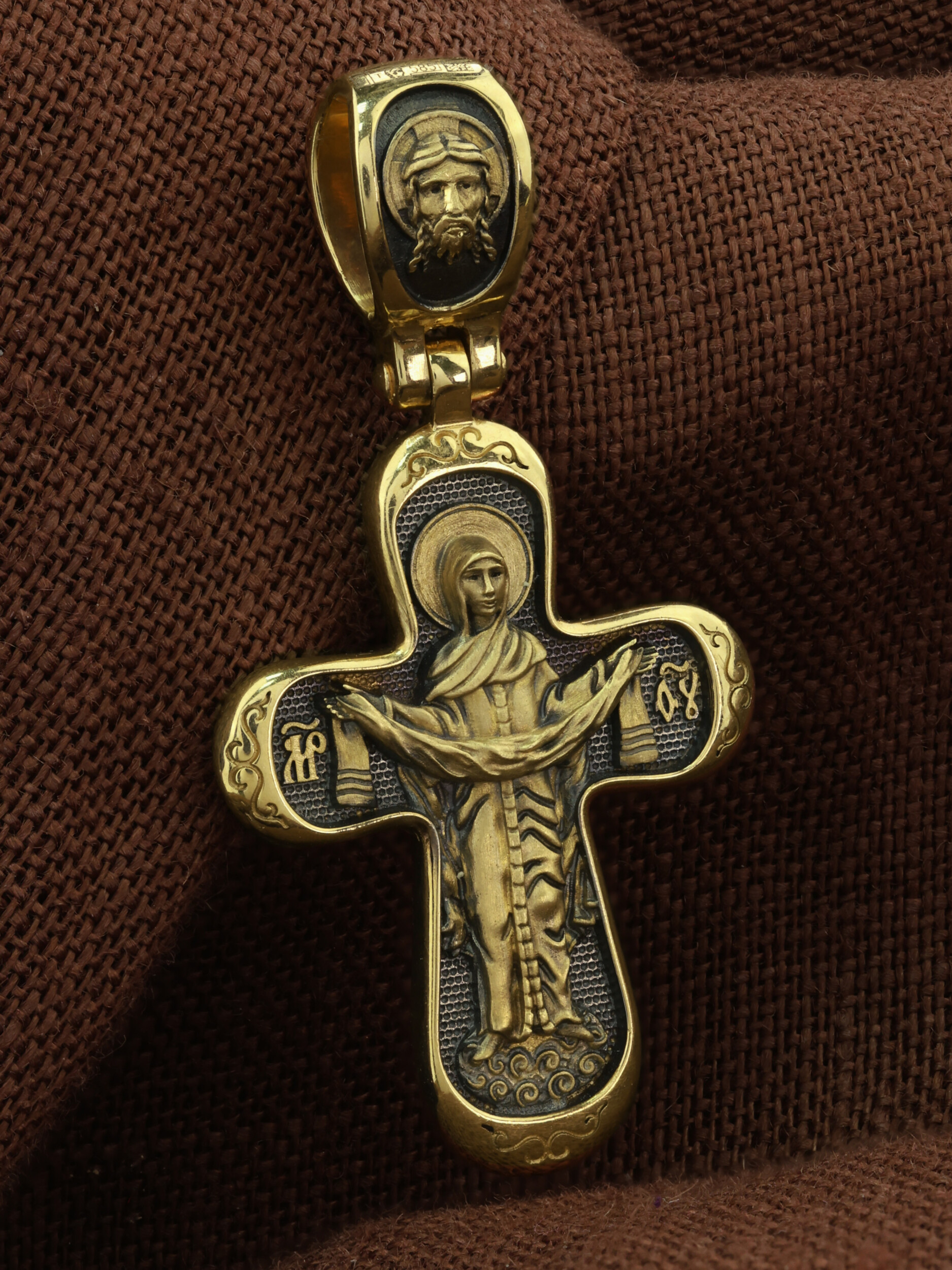 На обороте креста изображена икона Покрова Пресвятой Богородицы. Праздник Покрова Божией Матери является воспоминанием чуда, которое произошло во Влахнернской церкви 1 (14) октября 910 года: Пресвятая Богородица явилась верующим над алтарем храма и распростерла над ними Свое покрывало. В этот день Божья Матерь открыла людям, что Она является Ходатаицей за них перед Богом. Богородица простирает Свой молитвенный покров над всеми православными христианами и умоляет Сына Своего о даровании вечного спасения каждому человеку. На кулонном кольце изображен Спас Нерукотворный — Символ вочеловечившегося Божества и шестикрылый Серафим — самый приближенный к Господу Ангел.